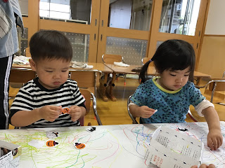 「おばけ描く!」「かぼちゃ描いてみる!」と張り切っているみかん組さん!
